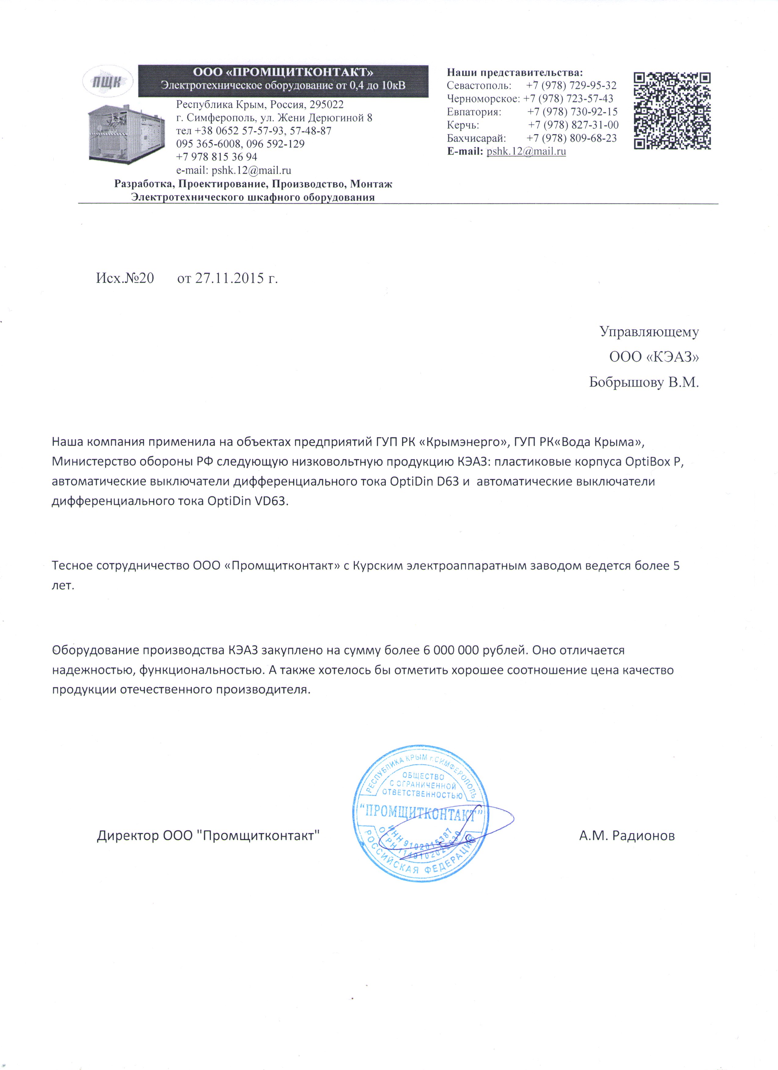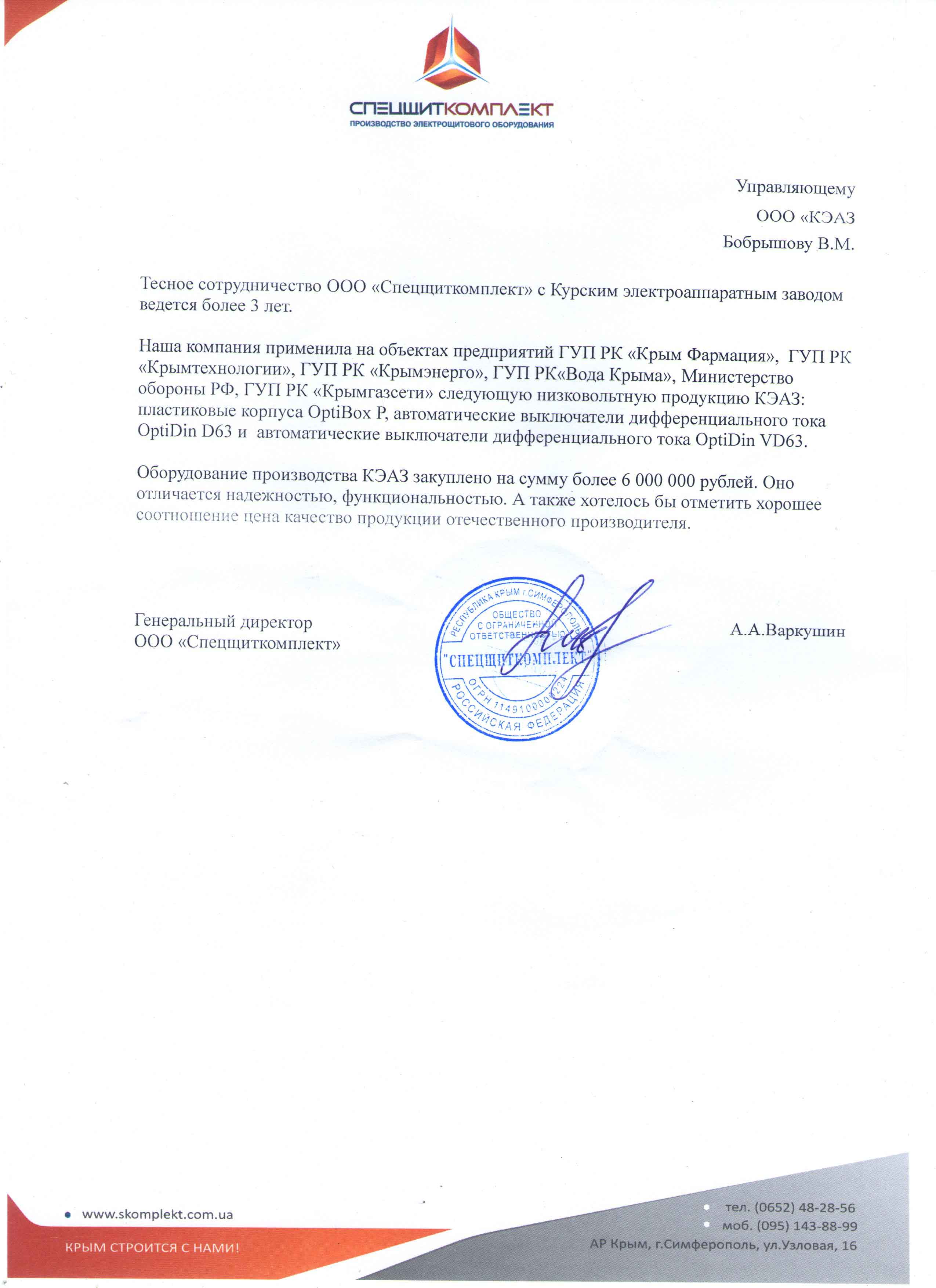 Референция ООО "Элком-Электрощит"