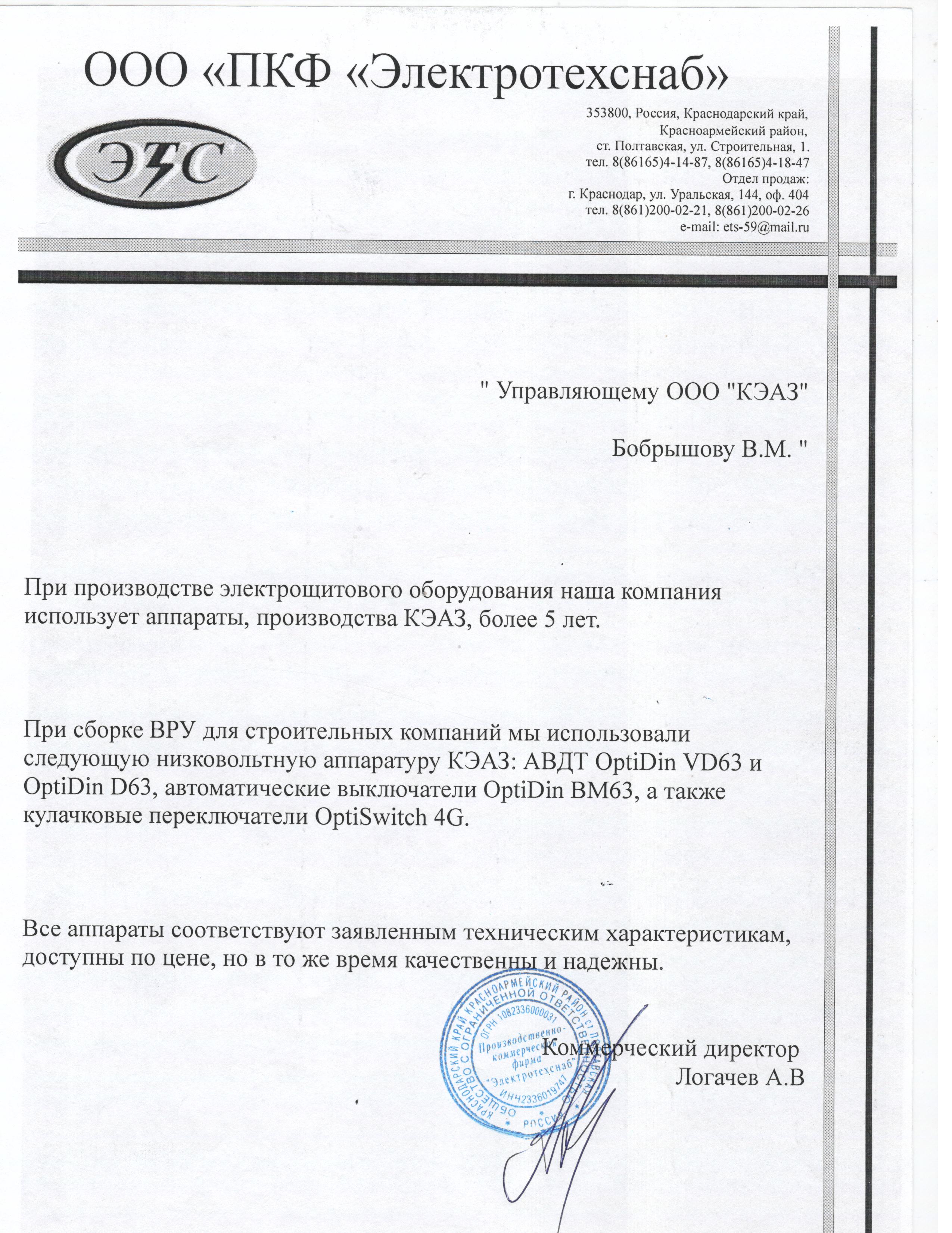 Референция ООО "ПКФ "Электротехснаб"